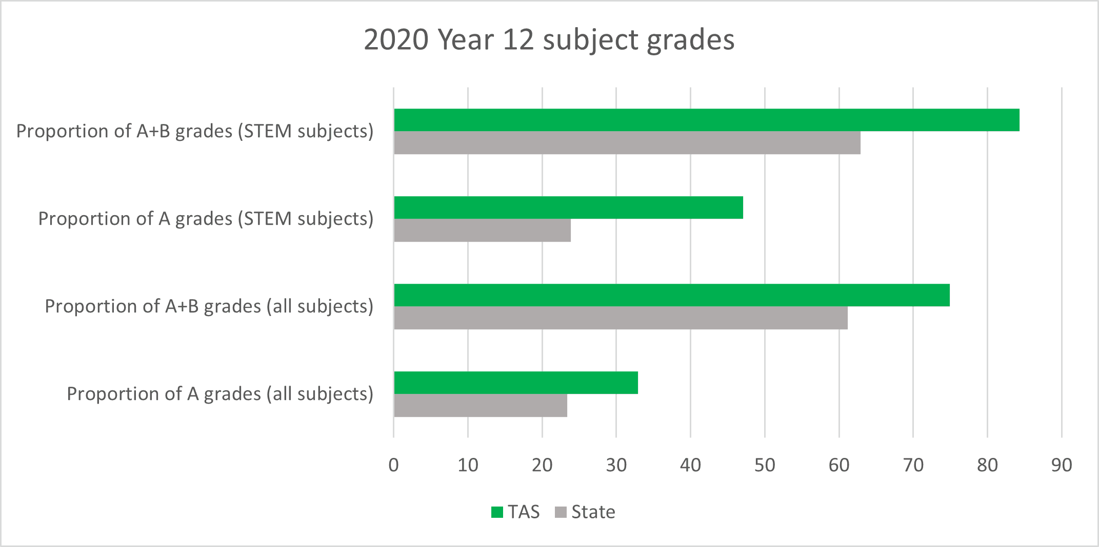 84.3% of all grades earned by all TAS Year 12 students were either A or B grades (compared to all state of 62.9%).